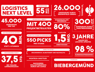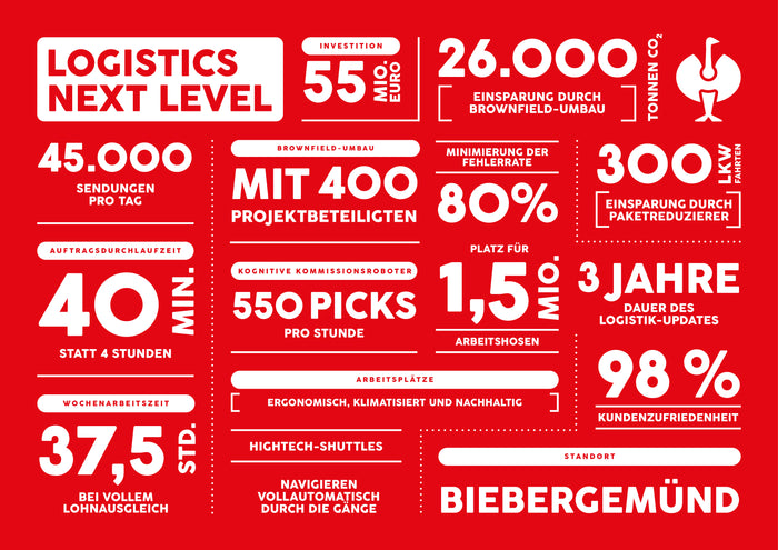Mit dem Umbau hat die Workwear Brand die Logistik auf Zukunft programmiert. Insgesamt können 45.000 Pakete das Headquarter in Biebergemünd täglich verlassen. Und auch die Arbeitshose landet jetzt schneller im Paket: 40 Minuten statt 4 Stunden. Durch das Neudenken der Logistik konnte zudem die Fehlerrate um 80 Prozent gesenkt werden. Möglich machen es smarte Logistiklösungen, Robotik und innovative Arbeitsplätze. Kognitive Kommissionsroboter können bis zu 550 Picks pro Stunde leisten. Autonome mobile Roboter (AMR) übernehmen den Transport zwischen 63 Retourenarbeitsplätzen und navigieren vollautomatisch durch die Gänge. Ein Paketreduzierer optimiert die Pakete automatisch – inklusive Recycling der Kartonreste.